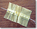 4. 黄色のリボンは折り目6個分(つまり12インチごと)づつカット。表を外側にして縦半分に折り、真ん中のラインの両端5ミリ弱くらいを残して、リボンの両端の縦糸を裂きます。針で端から縦糸をひっかけるようにして。その後、2インチごとに切り離します。