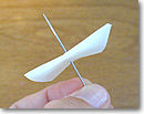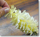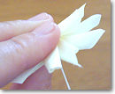8. 6枚まとめて指できゅっと押します。するとだ6個の花びらがいたい均等に広がります。それを糸の端(洗濯ばさみのところ)まで押し下げます。