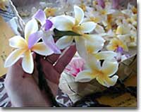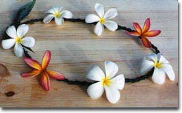 これだけでも、素敵なレイになりますが、今回はこれにプルメリアとランをツイストのすき間に差しこみました。たくさん花が用意されていたので、ここぞとばかり思いっきりぎっしり花を差しこんでいたら、スタッフの方が近づいてきて、「日本の人はぎっしり花を入れちゃうけど、本当はティーの葉が見えるところがキレイなのよ」と言われ大ショック。そうか、多けりゃいいってわけじゃないのか・・・。う〜ん、まだまだレイの基本がわかってないらしい。レイ・メイカーへの道は遠い。(Akiko)