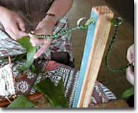 まずは2枚の葉を、ツヤのある面を外側に重ねて上の方でかた結びします。その結び目を、木の柱にフックがついている専用の道具(写真左)に引っかけて作業開始。最初に左右それぞれの葉っぱを左から右方向にねじり、そのねじった葉っぱをそれぞれ今度は反対に右から左へねじって(ツイストさせて)いきます。最初の2枚が残り5〜6センチになったら、新しい葉っぱをそれぞれに覆うように重ね、一緒にねじこんでいきます。つなぎめに葉っぱの端が出てしまうのはそれはそれでまた良いようです。ツイスト状に巻かれたティーが首にかけられる位の長さになったら、出発点の結び目の下のすき間に、終わりの端を通し、固結びをしてぬけないようにします。