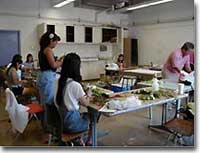 1日だけのクラスなのはちょっと残念でしたが、さっそく申込むことに。クラス名は「ハク・レイ・メイド・イージー」。便利なことに、クレジットカードがあればオンラインで申込めます。授業料は3時間クラスで30ドル。クラスの2日前に電話があり、「はさみと、霧吹きと、自分の好きな花と葉っぱを持ってくるように」とのこと。 「え〜、30ドルもとっといて材料費込みじゃないの??」とブツブツ言いながら、当日はうちのダンナ様が大切に育てているシダの葉を数枚こっそり拝借。しかし花に関してはどんな花を用意すればいいのかわからないので、授業前に花屋へ。「あの〜、ハク・レイを作る花をください。」と聞くと、案の定「どの花ですか?」という答え。「どの花かわかりません」という意味不明な会話の末、お店の人が白いランとシダの葉の花束を選んでくれました。結構大きな花束が、たったの4ドル。ハワイはランが安い!(もしくはこの花屋が安い?)。
