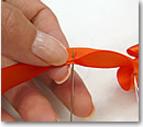| 3. リボンを半分に折り重ね、先ほどマーキングした所に針を通していきます。リボンの端から3ミリくらいのところを縫っていきます。そして、またマーキングしてある箇所を同じように2枚重ねて縫っていきます。その時に、あまりきつく閉めずに、ゆっくりと余裕を持たせるのがコツのようです。 | ![]() |
