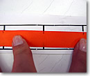 | 1. まずは、リボンにマーキング! 1.5インチ(約3.8センチ)間隔をボールペンで印を付けていきます。今回は先生が用意してくれた紙で作ったルーラーを使用。マーキングの時には、必ず同じ面の上か下かのどちらかに印をつけましょう。後で針を通す時にバラバラにマーキングされているとやりづらいからです。 | ![]() |