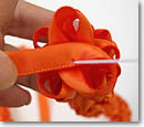 | 4. 縫い進める時のもう一つのコツが、レイを時計回りにまわしながら作ることです。プックリとした花の部分がらせん状になるように作っていきます。写真右のように、一つ前に作った部分の上にリボンが重なって、左方向に伸びるようにします。これがこのレイを作る時に、一番難しい部分ですね。私は最初、これが分からず「こんな感じ?」的感覚で縫い進めていったら、全然違ったようで、先生が全部直してくれました(汗)。このコツをつかむまでは、ちょっと難しいかもしれませんが、慣れたら簡単です。ひたすら、これを繰り返すだけ。 | ![]() |