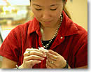 今回私が参加したのは、「ワイキキ・ショッピング・プラザ」の1階で行われているリボン・レイのレッスン。ここでは、毎週火・木曜日の午後3時30分から、約1時間半〜2時間のレッスンが行われています。会場へ行ってみると、いくつかのテーブルと椅子がステージの前に並べられています。先生は私より若いと思われるロコの女性。ステージの周りに集まった私たち生徒に対して、ステージの端を指差し、「作りたいレイを選んでくださ〜い」。指を刺している方向を見ると、色とりどりのリボン・レイが10本ほど掛けられていました。遠目に見ると色の区別しか付かないですが、近くで見ると大きさ、デザインなど全て異なっています。それがかなり可愛いんですよね。見ていると、全部のリボン・レイを作りたくなっちゃいます。