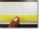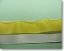 | 1.まずは、恒例のマーキングです。0.5インチ間隔で黄色のリボンの方にマーキングしていきます。白いリボンの上に黄色のリボンを重ねて縫っていくため、黄色の方にマーキングします。 | ![]() |