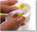 | 3. 縫い終わったら、花びらと花びらの間に人差し指が入るくらい間をあけながら、ギャザーを寄せていきます。写真のように、人差し指を下にして親指で寄せていくようにすると、花びらの間隔が人差し指くらいになります。この時のコツは、花びらがちゃんと開くようにギャザーを寄せることです。油断すると花びらがくるんと傘みたいになってしまうので要注意! | ![]() |