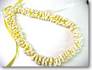 サテンのリボンで作るとなんとも本物のプルメリアと見まがうほど素敵です。けれど、一つ難点が… それは、花が一方方向に向いているため、首にかけていると、左はちゃんと花が自分の方を向いていても右の方は花が下を向いちゃっているんです。シガー・レイやクラウン・フラワーのレイなどはどこから見ても同じように見えるのですが、プルメリア・レイに関してはちょっとレイの半分が下を向くのが残念ですね。今回はサテンのリボンで作ったので本物のプルメリアのレイに近くなりましたが、素材をレースのついたリボンで作ってみると、シフォン・プルメリアと呼ばれるレイになります。作り方は同じですので試してみてくださいね。