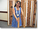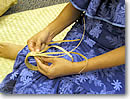 ![]() ラウハラ編みではブレスレット作りに挑戦。写真は講師アシスタントでロミロミ・セラピスト、元ミセス・ハワイのポハエさん |