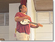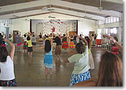 ●赤ちゃん連れもOKの気軽なクラス レッスンは短い休憩をはさみ、1時間30分。前半ではフラの基本ステップをみっちり練習。ナラニさんはステージの上でイプ(ひょうたん)を叩いてビートを取ったり、ウクレレを弾きながらハワイアンソングを朗々と歌ったり。その間、参加者の間を巡って動作を直してくれたりも。フラの基本ステップと言っても、全くの初心者には難しいものもあるかもしれませんね。列の前方は、このクラスに長く通うベテラン・ダンサー達が占めているので、初心者はお手本にするのがオススメです。 その他、踊りながらハワイ語で1から10を数えたり、ハワイ語のアルファベットを復唱したりと、軽くハワイ語を教えてくれる点も好評です。 |