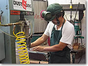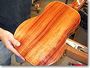 次いで、いよいよ工場見学に移ります。ツアーでは日本語の通訳を受けながら、ウクレレ作りの各工程の担当者から直接、そこでどんな作業をしているかの説明を受けていきます。まずウクレレの各パーツとなる板作りを担当するのが、ポールさん。単にコアの木と言っても、赤味がかったものがあったりオレンジ色だったり、ゴールドのような輝きがあったり。ポールさんは様々な違いを示しながら、ウクレレ作りのため、いかに適切な部位を定めていき板にするかという、興味深い話を聞かせてくれます。「僕の担当するのはウクレレ作りの素材の準備。半分は科学、半分は芸術に関わる範囲と言えるかもしれません」というポールさんの言葉に、深く納得してしまいました。 |