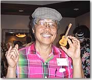 「このウクレレから、全てが始まったんです」とお茶目な笑顔でミニチュア・ウクレレと一緒に挨拶するアルヴィンさんのもとには記念パーティーの間中、ウクレレ好きの招待客が集まってきて歓談していきました。息子さんのアレンさんとアルヴィンさんをはじめ、この楽しそうなファミリーに会いたい人は、ウクレレ工場を見学してみてください。 |