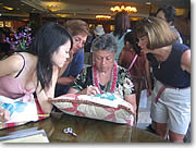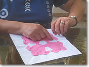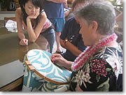●針を持ったことのない人にも丁寧に指導 このように参加者は、それぞれのキットを各々のペースで進めていき、わからない箇所や次のステップに入る際、キャロルさんに教わりながら進むというのが、このレッスンの進み方。針を持った経験のないアメリカ人男性にもキャロルさんは、糸の長さはどれくらいが扱いやすいか、果ては結び目の作り方から教え、大変根気よく、しかもごく丁寧な姿勢が印象的でした。作業をしながら、ハワイアン・キルトの歴史から、キルティングやアップリケなど異なる作業にふさわしい針の選び方、布を固定するには待ち針だけでなくヘアピンを使うとよい… など、キルト作りの上でのポイントや隠し技を披露してくれ、とてもわかりやすい実用的なレッスンでした。 |