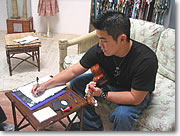 ●レッスンは飛び込み、予約、どちらでも なお撮影時に講師を務めていたアラン・フェリシアーノさんは、ハワイ大学に在籍中。大学では心理学を専攻中ですが、ウクレレ・メーカーからウクレレの提供を受けたこともあるほどの、セミプロ級プレーヤー。レッスン中に手描きで楽譜をさらさらと描き、何度も同じフレーズを繰り返して教えてくれる丁寧なレッスンの様子が、印象的でした。レッスンの申し込みですが、対象時間内であれば、飛び込みでもOK。ただ事前に予約を入れたほうが、待ち時間が少ないとのことでした。講師をリクエストしたい時も、予約を入れたほうが無難でしょう。 以上のようにローカル客や、ウクレレ経験者も参加する、同ショップの無料レッスン。次のハワイで、ぜひ挑戦してみてくださいね。 |