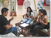 「大人数でのレッスンでは、どうしても各人のレベルに差が出て、ついていけない生徒が出てきます。そこでうちの店は団体ではなく、常に個人レッスンを心がけています。もちろん友人同士は一緒にレッスンできますが、それでも6人以上なら2グループに分けますね。あまり人数が多いと、自分の弾いたウクレレの音もわからなくなってしまいますから」と語るのは、スタッフの岸田さん。それも一方通行に講師がレクチャーするだけのレッスンではなく、生徒が質問しながら進めていきたいので、少人数制を採用しているとのことでした。 |