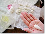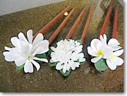最初にどちらかの花を選ぶわけですが、この時、バラの場合は好きな色をチョイスすることができます。クチナシなら、白の粘土にほんの少し黄色を混ぜ、本物そっくりのオフ・ホワイトに仕立てます。ついで花びらの数だけの小さな玉を作り、それを涙型にした後、花びらのように薄く指で伸ばしていきます。花びらが完成したらユキコさんの指導に従って、それを花型にまとめていくと…写真のように本物さながらの花が仕上がり、その愛らしさには作った本人がびっくりしてしまうほど。