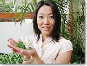 最後は、葉を仕上げて終了です。軽量粘土には赤、青、黄色の3原色、それに白、黒があり、この5色を混ぜ合わせると、あらゆる色がクリエイトできる、とユキコさん。黄と青、黒の粘土をまぜると、なるほど、きれいな緑色になりました。これをプラスチックの葉型の上で伸ばすと、またまた本物そっくりの筋の入った葉に。葉をつけると、さらにリアルなクチナシの花が出来上がり! ここでレッスンは終了し、ホテルの部屋などで半日から1日、自然乾燥させると、ちょっとやそっとの刺激では壊れないクレイフラワーの完成です。