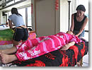 佐藤美智子さん(神奈川・横浜市)の話 「2週間の予定で、ロミロミ・マッサージのクラスに参加しています。東京でアロマテラピーの学校に通っていて、将来はセラピストになるつもりなので、大好きなハワイで、今、日本でも人気上昇中のロミロミを学ぼうと、このクラスに参加しました。ロミロミは結構、力を込めてマッサージするので、効き目のあるマッサージだと思います。短期で参加しましたが、HIMACのクラスは雰囲気もよく、勉強していてとても楽しいですよ」