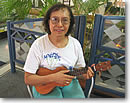 さて、8人が参加して行われた取材時のレッスンでの習曲は、「マヒナ・オ・ホク」。まず、ロレインさんがそれぞれの立ち位置を決め、レッスンのスタートです。ロレインさんがステージに立ち、マイクを使って説明しながら、フラの基本ステップ、それに合わせた手の動きを、1節ずつゆっくり習っていきます。その後は、同じ節をロレインさんのウクレレに合わせて踊り、さらに次の節へ。ゆっくりゆっくり、難しいステップや手の動きは何度も繰り返しながら少しずつ進んでいき、ロレインさんも参加者も真剣。全員が集中してレッスンが進み、30分もたつと参加者の方々が結構優雅に踊り始めました。