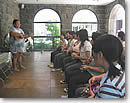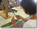 ランチ後は午後零時15分から、いよいよレイ・メイキングのレッスン。ティーリーフ・レイ作りに挑戦します。この日講師を務めたのは、同博物館教育部のカルチャー教育スペシャリスト、ノエラニ・カプアアクニ・タシャラさん。緑の葉ティーリーフを示しながら、ティーリーフがハワイでは神聖な植物であり、フラ・ダンサーにとっても大切な植物であることなど、ティーリーフのハワイでの意義について詳しく解説してくれます。