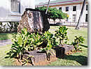 霊廟跡の山側にある宮殿事務所前にも、もう一つ、曰く付きの物があります。事務所前のキャプテン・クック記念碑の前にある「リロアの聖なる敷居岩」がそれ。リロアとは15世紀にハワイ島を支配していた、カメハメハやカラカウアの先祖とされる大酋長です。そのリロアの住居の敷居にあったとされる岩が、カラカウア王によってホノルルに運ばれ、巡り巡ってこの場所に設置されたと言われています。一見、何の変哲もない長方形の岩ですが、一説によると不思議なマナ(ハワイ語で霊力のこと)が宿っているそうで、そのマナが強すぎて、周囲に植えたヤシの木が何本も枯れたという話まであります。何せ、昔は庶民が手を触れただけで死刑になったという神聖な岩なのですから、皆さんも足をかけたりなど、間違っても罰当りな真似はしないように注意してくださいね。