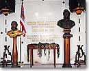 この18人に加え、1865年以降に亡くなった王族、たとえばハワイ王朝7代目のカラカウア王やその跡を継いだリリウオカラニ女王、そのほかにカイウラニ王女、クヒオ王子など、主だった王族達がこの地に埋葬され、その数は53人。緑に包まれた広い敷地の中に、カメハメハ直系王族、カラカウア直系王族など4つのグループごとに分かれた埋葬所があり、それぞれの墓碑の地下に亡骸が眠っています。昔、ハワイには火葬の習慣がなかったので、ほとんどの王族の亡骸は棺に入れられ、ある棺の上には王族だけが着けることができた鳥の羽のマントなどが広げられたまま、安置されたそうです。以前、ロイヤル・モザリアムは王族とその関係者しか訪れることができませんでしたが、1947年からは一般に公開されています(ただし、地下室に降りることはできません)。