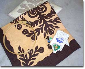 で、前置きが長くなりましたが、そのお部屋のベッドカバーがなんとハワイアンキルトだったのです。それはそれは素晴らしいオフホワイトの布に、確かベビーグリーンの葉のようなパターンのデザインでした。私は生まれて初めてハワイアンキルトに見とれ、しばし、そのキルトの上に寝ころんでじっくりとそのキルトを見ていたのでした。まさに、感動です!! その旅からホノルルに帰り、私はその足でハワイアンキルトのキットを探してまわりました。が、そのキットはかなり説明不足。全くやり方がわからず、途方にくれていました。しかし、友達の紹介で運命のKathyとの出会いが待っていたのです。私の師です。その次の日にはもうクラスにサインアップし、すぐにキルトを習いだしたのです!! それからこの4年間に作った作品が、う?ん、ホントにたくさんあります。
