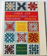 POAKALANIというハワイのキルト作家の最新のパターン集です。ハワイアンキルトのまずはパターンからの作り方も簡単に説明してあります。クッション用15パターンが紹介されていて、図でもわかるようにこの本のパターンをトレースして、クッションができるように、キルトラインも事細かに描いてあります。日本では手に入れることが難しいかと思われますが、この手のパターン集が1冊で15パターンのクッションもできるということでは、お勧めの1冊です。これはハワイの書店ではほとんどが扱っています。