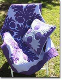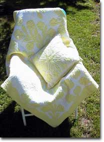 ここで実際私の娘が愛用してくれている(と信じている母)ハワイアンキルトをご紹介いたしましょう。前にこのページでもご紹介させていただきましたが、紫色のパンの木と、黄色のプルメリアのベビーキルト、それとマッチングしたクッションです。気を使ってきれいに使ってくれないので、ちょっと汚れていますが、そこがまた実用的なキルトとしてはいいんじゃないかと思います。その代わり、キルトは何回も洗い、とっても柔らかく気持ちよくなっています。コットン元来の味が出ています!