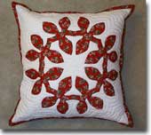 始めのクッションはマイレのリースのデザイン。クリスマスプリントじゃなかったら、普通のハワイアンキルトですよ。でもクリスマスプリントを使うだけで180度違うでしょ??!!私はこのクッションをとっても気に入っているのです。デザインだけではなく、周りのパイピングも同じプリント柄を使用します。いい感じでしょ??
