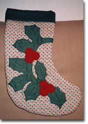 ストッキングといういわゆる長靴はアメリカではとても人気の高いクリスマスグッズです。これは大きいし、大切な方へのプレゼントは中にキャンディーや他のプレゼントも入れて、差し上げられるのです。アップリケも小さいし、キルティングも少しなので、結構簡単にできますよ!これも下生地をクリスマスプリントにしたら、アップリケの部分は無地にするとか、下生地を無地にしたら、デザインをクリスマスプリントにするとか、自分なりに自由に工夫してみてください。