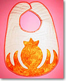 表はパイナップルのデザインを黄色のむら染めで。裏は(写ってないのがちょっと残念だけど)オレンジのアロハ柄(ハイビスカス)で作ってあり、な、なんとリバーシブルなんです。これは素晴らしい。そして自分の娘に合わせて、大きさを変え、使いやすいようにアレンジしてあるのです。これはちょっともったいないくて、赤ちゃんのエプロンにはできないよー! だからお出かけ専門にするそうです。それにしてもお見事!