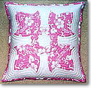 さてさて、お次はまたまた違うお友達の作品です。普通のククイナッツのデザインのクッションがこのようなポップなクッションに大変身です。これはびっくり。ピンクのアロハ柄の生地をデザインに持って来ただけで、このようなかわゆい作品になってしまうのです。ホントにかわいい。