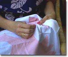 左右対称4つの模様のうち、1つが終わるか終わらないかで、第1日目は終了。 アップリケは1週間目の宿題ということになります。針は指に刺すし、布は汗でテロテロになるし、結構第1日目は緊張と焦りで、疲れてしまいます。このクラスに必要なものは、よく切れる布はさみ、糸切りばさみ、しつけ糸、まち針、かな?もちろん、キャシーのクラスにはハワイアンキルト用布、その色にあった糸、針が含まれます。家に帰ると、真っ先にキルトキットを取り出し、宿題だったアップリケを始めてしまうのです。たぶん、主婦の方は子供や、旦那様のご飯や、家庭のことはそっちのけで、始めてしまうことでしょう。実際、私はその宿題を1日で終わらせてしまったんですから。。。。そして友達に見せまくった。うれしくて、うれしくて、ハワイアンキルトだぞ!!って感じ。今にしてその作品を見ると、ちょっとお粗末。。。でも私にとってはかけがえのないファーストキルトなんです。