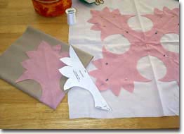 キャシーのクラスは1ヶ月でクッションを作るということになってます。前回の第1日目はその後、パターンを、もう一枚の45センチX45センチの布に広げていきます。そうして折り目をそろえて、しつけをします。これでもうハワイアンキルト!!!ってなもんです。