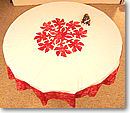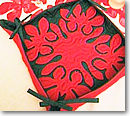 そしてあとはクリスマスディナーのテーブル。お友達をご招待し、思いっきりご馳走しましょう。テーブルの上はハワイアンモチーフのテーブルクロス。これはティアラのデザインです。白の下地に赤いアロハ柄を乗せて見ました。アロハ柄は少し縫いにくいですがとってもハワイ風でしょ? パンのバスケットはハワイアンキルトでどーんと(Kちゃん作)。こんな風に自分流にアレンジをしてみて下さい。なんて素敵なクリスマスでしょう。誰かへのプレゼントだけじゃないく、お部屋のインテリアに凝るっていうのも、自分自身へのプレゼントになりますね。