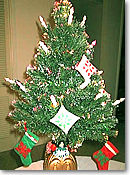 でもハワイはもうどこもかしこもクリスマスです。ショッピングセンターは素敵に飾られ、街並みはイルミネーションでとても綺麗です。さて、年に1度のハワイアンキルト実力発揮の瞬間ですぞ。ここぞとばかりに皆に見せないと絶対損しますよ!さあ嫌というほど、ハワイアンキルトを飾り付けましょう。今年はクリスマスツリーをハワイアンキルト風に飾ります。大きいツリーも素敵だけど、小さいツリーは自分の思い通り何でもできるので、とても便利です。ハワイアンキルトのモチーフを使ったクロスステッチのオーナメント。これは誰にでも簡単にできます。それに時間もかからないしね。小さいハワイアンキルトの付いたストッキング。これだけ飾るだけで、ホントにハワイアンのクリスマスって感じがするでしょ?皆さんも真似してみてはいかが?