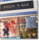 「キルツン・コア」はワイキキからタクシーで約10分。今はトロリーバスが通っているのでとても便利になりました。お店の外側にはキャシー作のハワイアンキルトが出迎えてくれます。そして店内は大きなハワイアンキルト、数種類のパターン、コットン100%の布地、そしてハワイアンキルト小物、コアウッド小物が所狭しと飾られています。