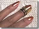 とても小さい事ですが、ハワイアンキルトと長く、長くつき合って行くためには、1つ1つ自分のお気に入りの逸品を見つけ、キルティングを「COMFORTABLE」な環境にすることが大切です。そのためには自分の足で、いろいろな手芸屋さんに顔を出したり、他のキルターが使っている道具をチャレンジしてみたりして自分の逸品を見つけだすことです。もう一つの私の隠れた逸品はキルティングには不可欠な「シンブル」です。ネールがぶつからない、ネールを外に出して使えるような代物です。これで私もネールを短くしないで、キルトが出来たのですから。