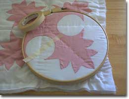 マスキンテープのありがたさはホントに凄い!です。我が師キャシーのアメリカ本土からの生徒さんが教えてくれたそうです。チャコを消したり、ペンの後を洗ったりする、手間が省けます。ただ、難はちょっと針がべたべたになり、キルティングがしにくくなる点かしら??でも針はふけばもとに戻るので大した問題ではない。。。