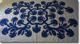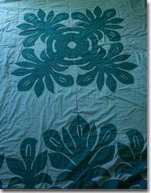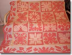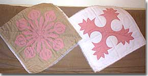 ボンバックスのデザインが大好きで始めました(写真左)。これはダブルサイズのベッドコンフォートになります。(予定)アップリケは完了してます。あとはキルト芯、裏生地を重ね合わせて、キルトを始めるのみです。デザインの生地は日本で買ってきたむら染めを使用。むら染めはキャシー中島さんがたくさん使っていらっしゃるようですが、ハワイアンキルトがちょっと日本的になるのが、不思議ですよね。生地自体も柔らかく、とてもキルトしやすい生地だと思います。
