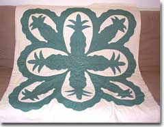 アンティーレイからいただいた、ほぼ正方形のパイナップルの素敵なキルトです。この大きさはベビーキルトとほぼ同じくらいかな??と思います。これは初めての試みで、コットン100%のキルト芯を使ってみました。このキルト芯は空気を閉じこめるので、暖かいと聞きました。大好きな緑のキルトなので、これは私の物になるはずです。(予定は未定)キルティングの途中です。