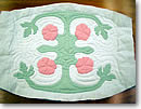 そして、いつもと同様に、アップリケ生地を下地の上にのせ、デザインに沿ってしつけ縫いをし、アップリケをしましょう。その後、キルト芯、裏地を合わせ、中心よりしつけをします。さらに、落としキルト、飾りキルト、エコーイングキルトを行いましょう。