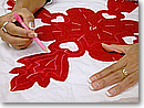 次は、飾りキルトに入ります。「飾りキルト」とは、アップリケのキルティングのこと。キルティングの中でもメインの工程とも言えそうな、この飾りキルト。まずは、チャコペンを使って、アップリケ上に1.2cm位の間隔でキルトラインを描きます。アン先生のキルトキットにも付いている、キルトライン・サンプルを見本に、布に直接ラインを描いてみましょう。キルティング作業をするうちに、チャコペンで書いたラインは薄くなっていくそうです。チャコぺンで書いたラインが気になる人は、でき上がってから、軽く水洗いすると簡単に落ちますよ!