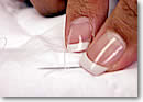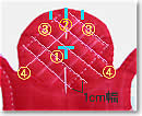 ラインはきれいに描けたでしょうか? キルトラインを引き終わったところで、飾りキルトを行います。キルトライン上を「落としキルト」(第4回参照)の縫い方と同じ要領でキルティングしていきます。右手中指と親指、布の下に置いた左手人差し指を使いながら「テコの原理」で、できるだけ細かく縫いましょうね!