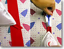 バイアスを一直線に広げて、縫い代部分の重なった生地が、両側に広がるようにアイロンがけをします。そして、ここで登場したのが、2.5cm幅用バイアスメーカー! 「驚くほどきれいに、バイアステープができるのよ!」とアン先生。「本当かしら…」と観察していると、バイアスをバイアスメーカーに入れると、2.5cm幅になるよう両端を折り曲げくれるじゃないですか。「なんて、優れもの!」。定規で測りながらアイロン掛けする必要なんて全くないんですね。でき上がった状態のバイアスは使ったことがありますが、「自分でバイアスを作ることなんて、できるの?」と、ちょっと驚き! 2.5cm幅に折られたバイアスを端からアイロンで押さえていきましょう。アイロンを掛けた後、バイアス縫い合わせの位置で、折り目からはみ出てしまう生地は切りとります。