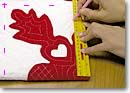 ●●エコーイングの下線を引くときは…●● あまりエコーイングのラインを1.2cmとこだわると、暖かみのないキルトになってしまうので、定規で測らず、自分の感覚でやってみましょう。人差し指の太さくらいの感覚ですね(私のは太いかしら?) |