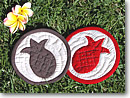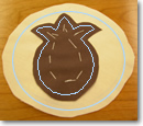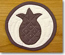 パイナップルデザインの型紙を切り取ります。今回も、アン先生のハワイアン・キルトキットを使いました。デザインはアン先生のキルト・キットに含まれていた、かわいらしいパイナップルの型紙を使用! 左下の写真のように、中心をパイナップル型に切り取られた円と、パイナップル型に切り取ったデザイン両方を使い、計4枚のコースターを作成します。