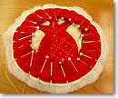 余分なキルト芯と布はカットしましょう。3.6cm幅の布で1.8cm幅のバイアスを作成します(バイアス作成方法参照)。1.8cm幅に仕上がったバイアスをコースターの外側におき、まち針でとめます。そして、バイアスを折りコースターを裏にしバイアスをまつり縫いします。このパイピング作業が終了したらしたら、パイナップル・コースターのでき上がりです!
