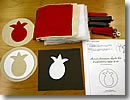 16cm四方に切られた、アップリケ用の布と下地の布を用意しましょう(アン先生のキットを使用する場合は、これらの布もキットに含まれています)。アップリケ用の布の上に、STEP1で切った型紙をおき、まち針でとめ、デザインに沿り、チャコペンで線を引きます。型紙を取りのぞき、デザインの2-3mm外をカッティングします。